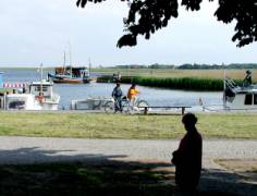 | Unser Hotel liegt dicht am Hafen. Wir suchen vergeblich den Hoteleingang. Also benutzen wir einfach den Restauranteingang, was natürlich falsch war. Egal, wir melden uns bei der Rezeption, lassen uns auch gleich den richtigen Eingang zeigen, bekommen unsere Zimmerschlüssel und suchen unsere Zimmer auf. Nach dem Kofferauspacken nutzen wir die Sonne und spazieren auf dem Deich, besichtigen die kleine Dorfkirche und lauschen den Klängen eines jungen Orgelspielers. Bald finden wir uns alle in einer urigen Gaststube des Hotels zum Abendessen ein. Gut gesättigt plaudern wir noch ein Stündchen. Bald überfällt uns die Müdigkeit nach so einer langen Reise. |