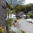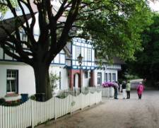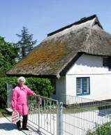 Hier und da tauchen rohrgedeckte, schmucke Häuschen auf. Schnell entdecken wir ein kleines Gartenlokal, um uns auszuruhen, einen kleinen Imbiss zu uns zu nehmen und vor allem um etwas zu trinken. Cathleen labt sich an frischem Kräuterquark mit Kartoffeln. Sie ist so begeistert, dass ein jeder kosten muss. Hmmm, schmeckt wirklich toll, der Quark! Ein Kuckuck erfreut uns mit seinem Ruf. Kindheitserinnerungen werden wach. Yvonne ist so fasziniert, dass sie sich spaßeshalber Frau „Kuckuck von Hiddensee“ nennt, zumal sie den Kuckucksruf fast echt imitieren kann. Erholt und gestärkt wandern wir auf einem anderen Weg zurück nach Kloster, vorbei an einem Teich voller quakender Frösche. |