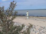 Zum Wandern ist mir die Strecke zu lang, deshalb kehren wir um, fahren weiter nach Neubessin, stellen das Fahrrad ab und wandern durchs Naturschutzgebiet bis zum Wasser. Hier finde ich winzig kleine Muscheln, und hier verweilen wir noch ein bissel, um das Anschwemmungsgebiet zu beobachten. Bald treten wir den Heimweg an. |